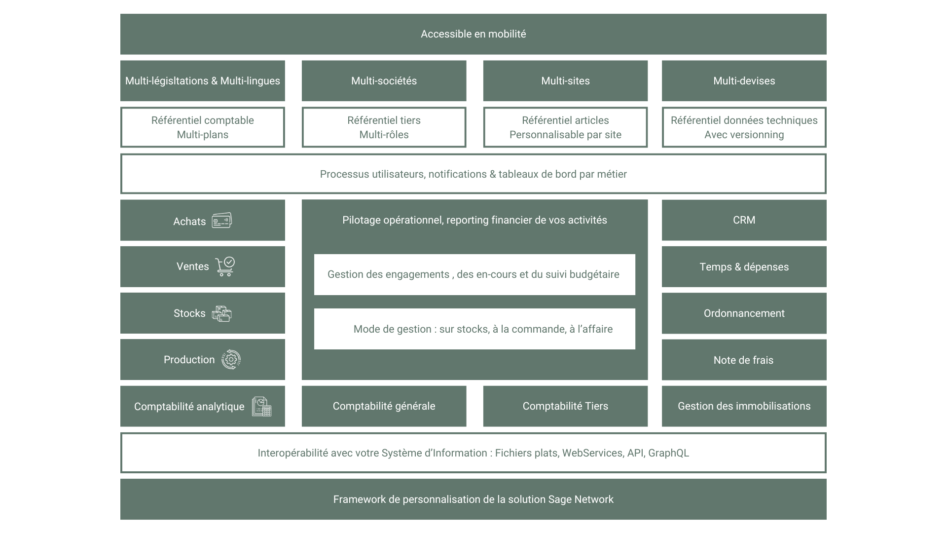 • Interopérable avec votre système d’information : Sage X3 peut être intégré à d’autres systèmes via des fichiers plats, webservices, API et GraphQL, facilitant ainsi l’échange de données et l’expansion des fonctionnalités.