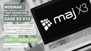 Webinar MAJ’X3 Jeudi 11 mars 2021 à 11h00 Que vous soyez déjà équipé de Sage X3 V12 ou que vous projetez de migrer votre ancienne